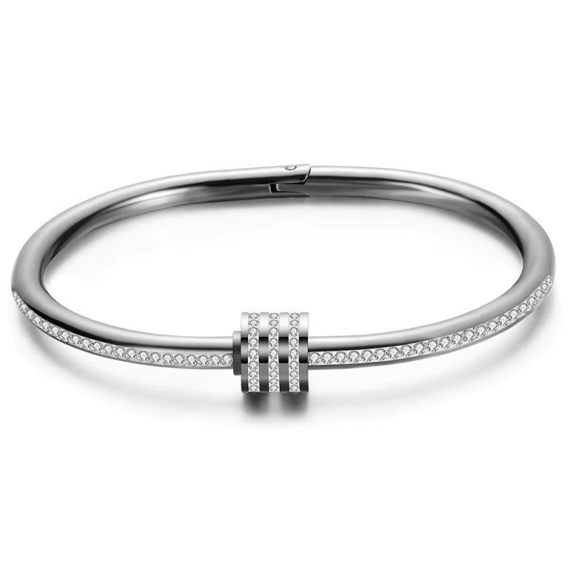 The Crystal Wrap Bangle features a beautiful coil of clear cubic zirconia stones, meticulously set in waterproof stainless steel. Its wrap-around design mimics a graceful wrap, perfect for stacking, styling, and shining whether you're working, wandering, or waltzing into the night.