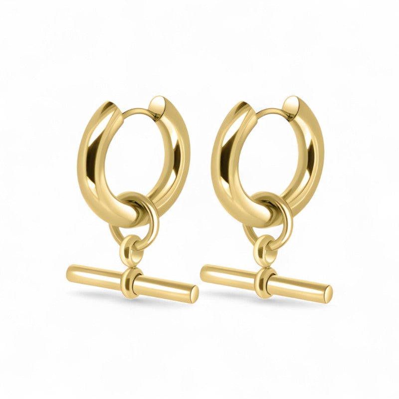 Our T‑Bar Hoop Earrings put a modern spin on classic hoops with a sleek T-bar charm. Crafted from waterproof, 18 ct gold-plated stainless steel, these lightweight huggies are designed to be your constant style companions, from morning meetings to midnight sets.