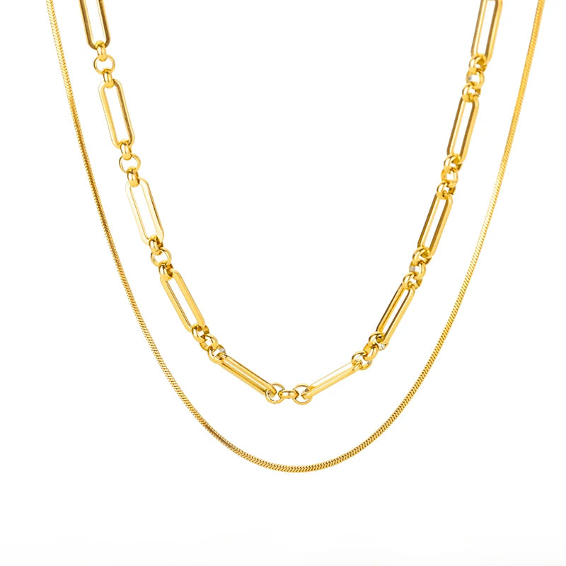 Double the chain, double the charm. Featuring a sleek paperclip base topped with a delicate snake chain, this gold-plated layered necklace gives modern minimalism with a twist, effortlessly chic and endlessly versatile.