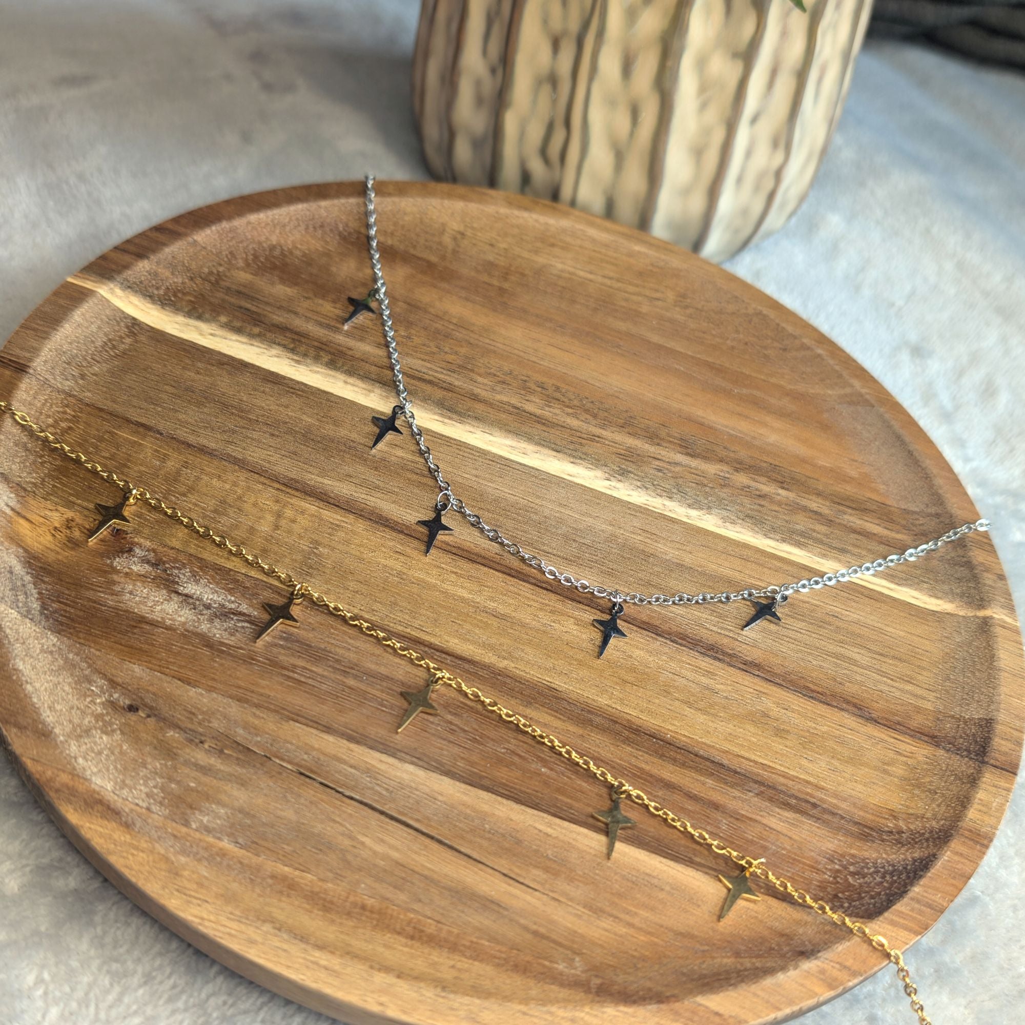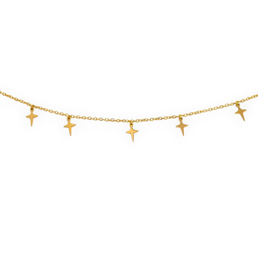 The Star‑Gazer Choker features tiny star charms dancing along a waterproof, gold-plated chain. Crafted to accompany you from morning calm to festival chaos, this piece brings effortless sparkle and cosmic charm to any look.