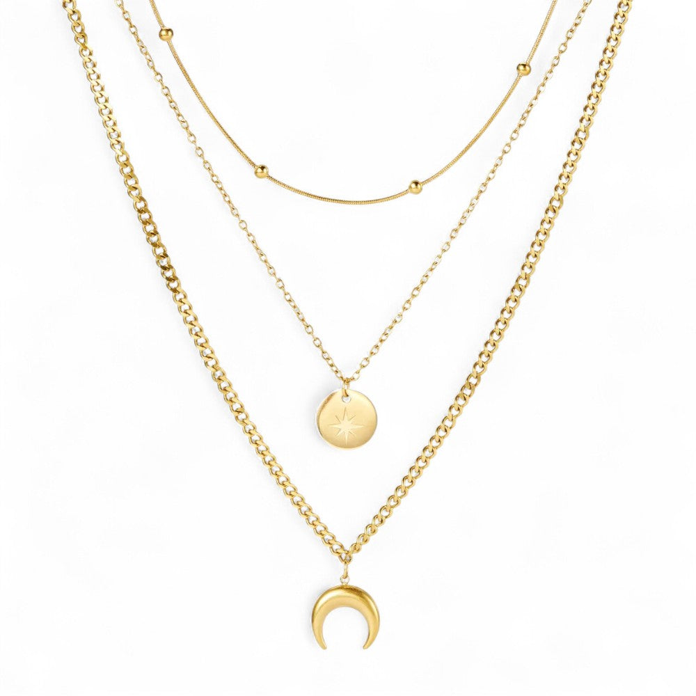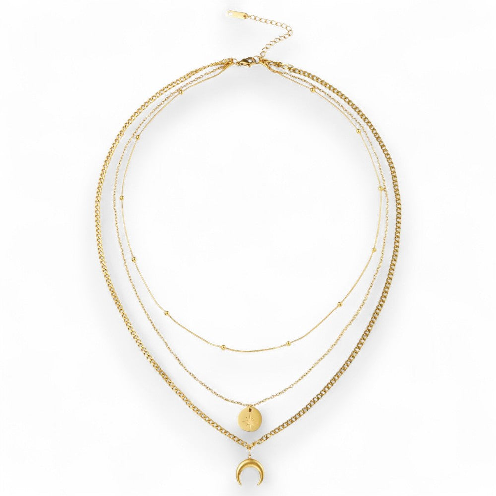 Three-tiered starlight magic, this gold-plated layered necklace features delicate chains sprinkled with tiny celestial charms that shimmer softly like the night sky. Effortlessly ethereal, endlessly versatile.