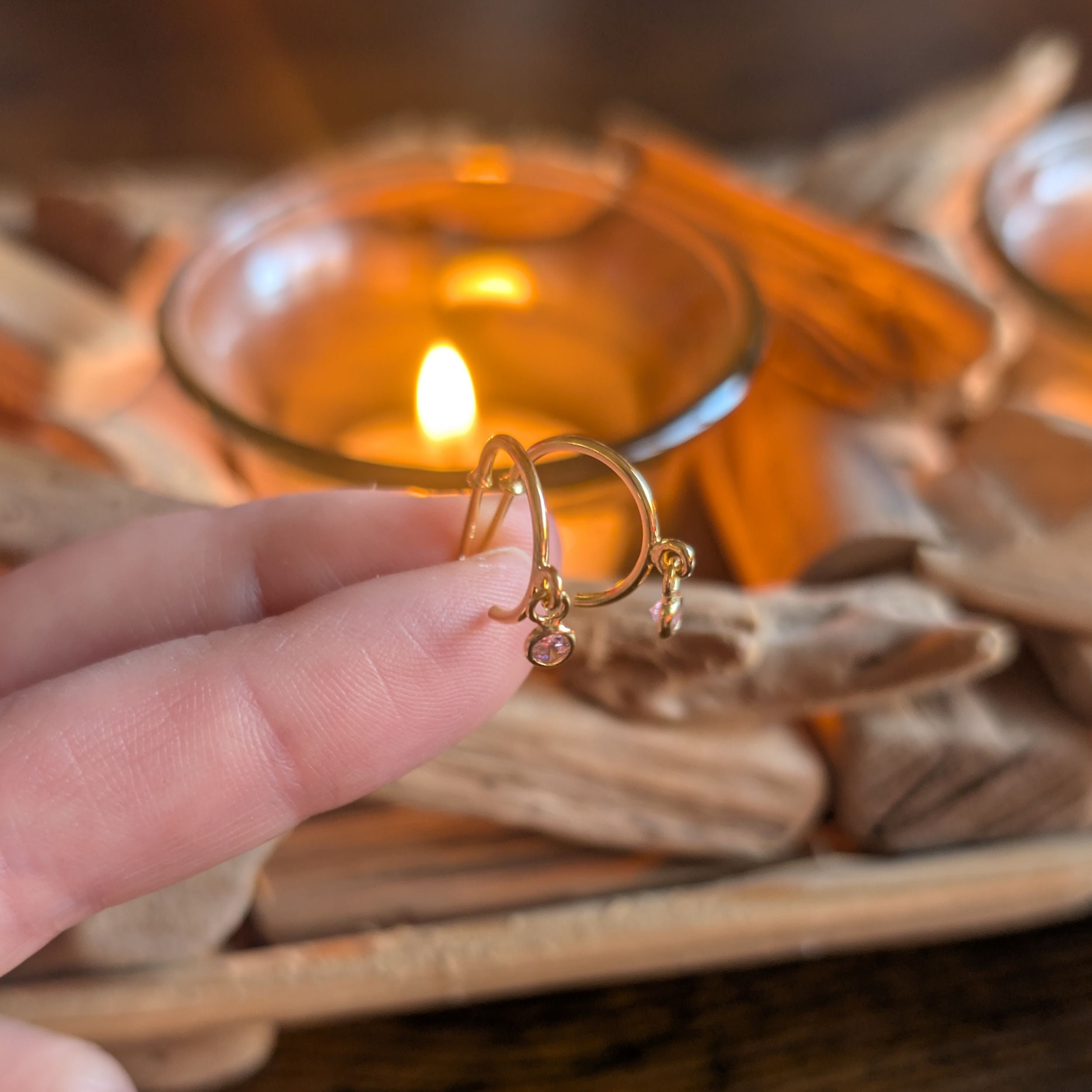 • Design: Small hoop earrings with soft pink sparkle
